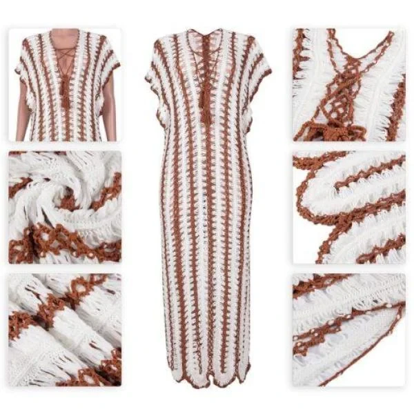 The off-shoulder design offers an elegant, relaxed vibe, while the adjustable tie feature ensures a perfect fit for all body types. Whether you wear it over your swimwear or as a chic standalone piece, this dress brings out your carefree, bohemian spirit. Its intricate crochet pattern adds texture and detail, making it a truly unique addition to your summer wardrobe.