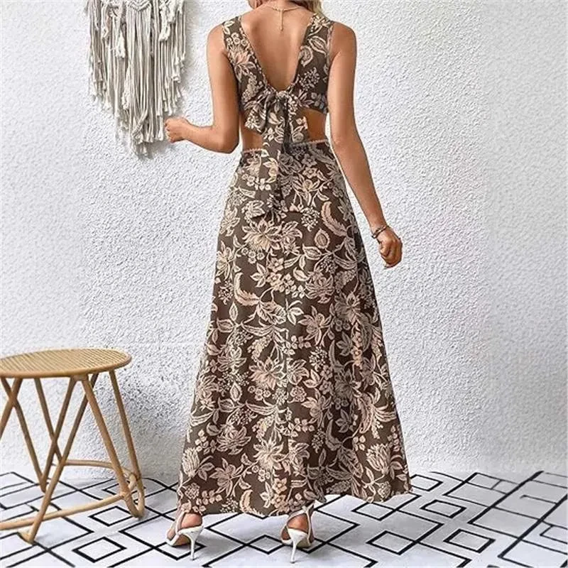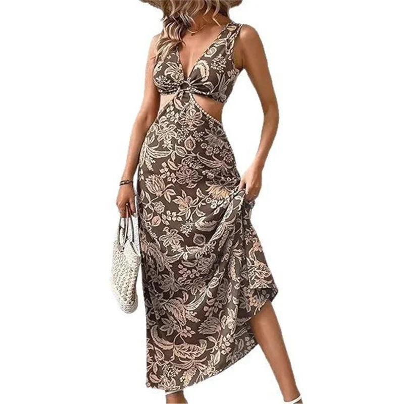 Handmade Printed Waist-controlled Strap Vest Long Dress